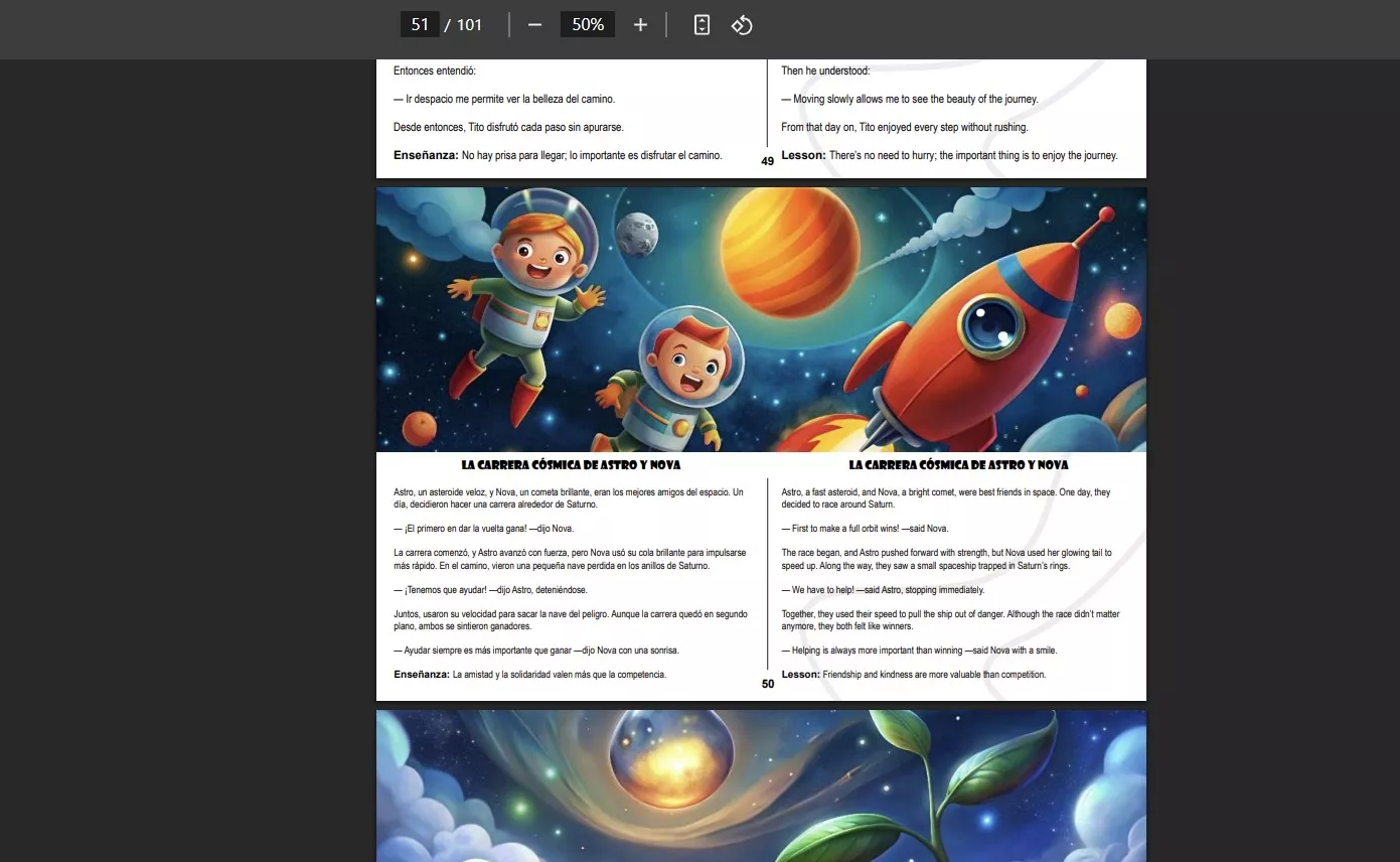 Este libro ilustrado presenta una colección de 100 cuentos infantiles en español e inglés, diseñados para facilitar el aprendizaje de una segunda lengua de forma eficaz y creativa. Cada cuento combina narrativas atractivas con valiosas lecciones, promoviendo el desarrollo del vocabulario, la comprensión lectora y la familiarización con las estructuras gramaticales en ambos idiomas. Con un enfoque didáctico y atractivo, este material es ideal para padres, educadores y cualquier persona interesada en fortalecer el bilingüismo infantil a través de la literatura.